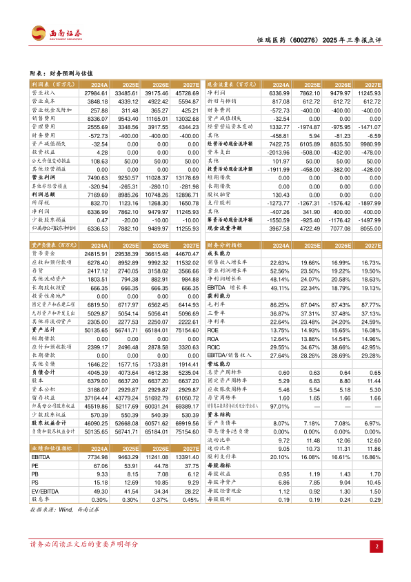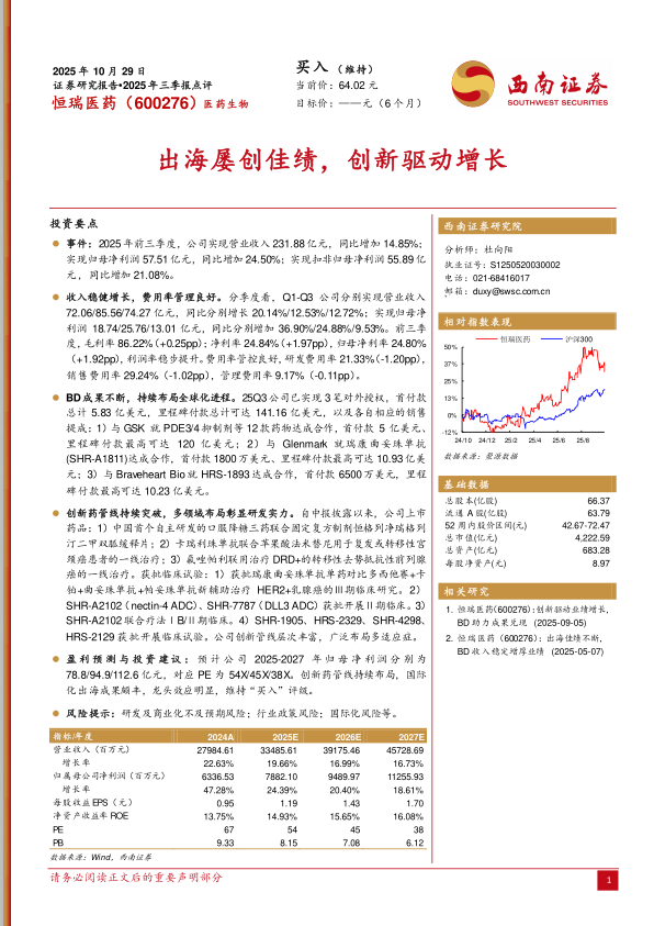 盈利预测与投资建议:预计公司2025-2027年归母净利润分别为78.8/94.9/112.6亿元,对应PE为54X/45X/38X。创新药管线持续布局,国际化出海成果颇丰,龙头效应明显,维持“买入”评级。