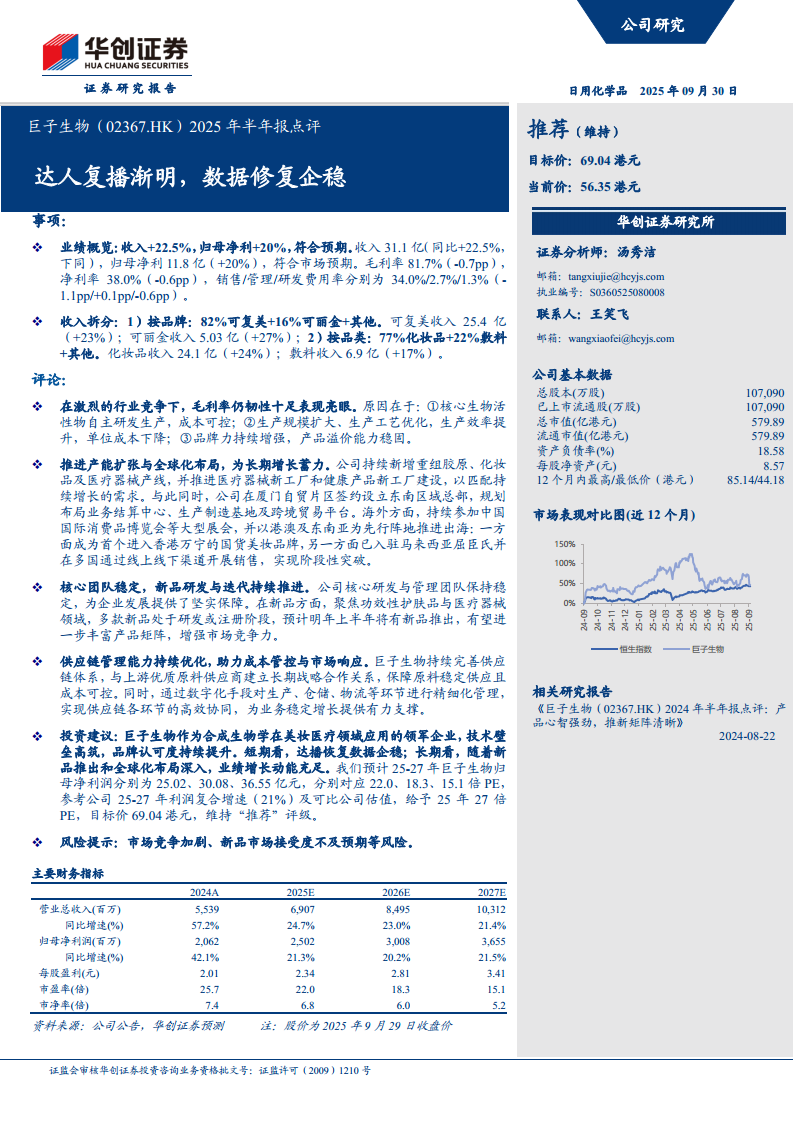 巨子生物(02367):2025年半年报点评:达人复播渐明,数据修复企稳