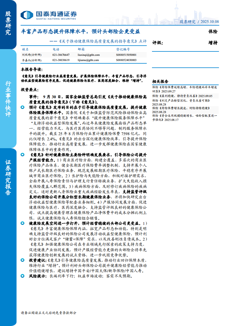 《关于推动健康保险高质量发展的指导意见》点评:丰富产品形态提升保障水平,预计头部险企更受益