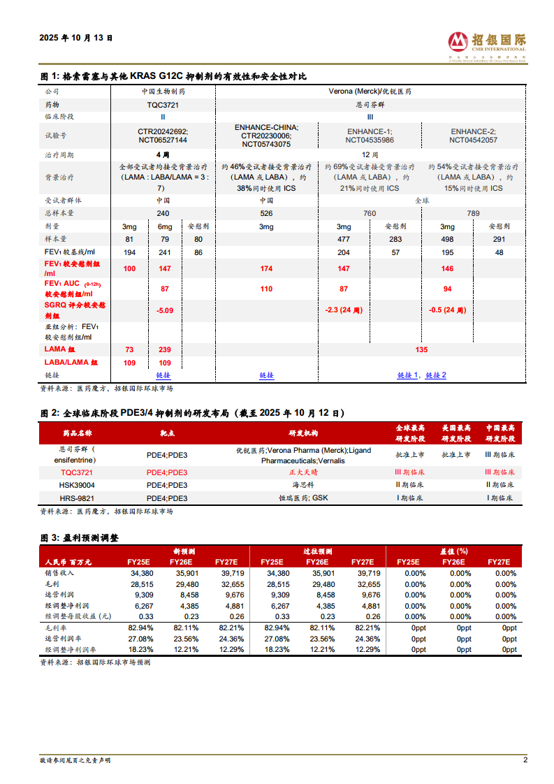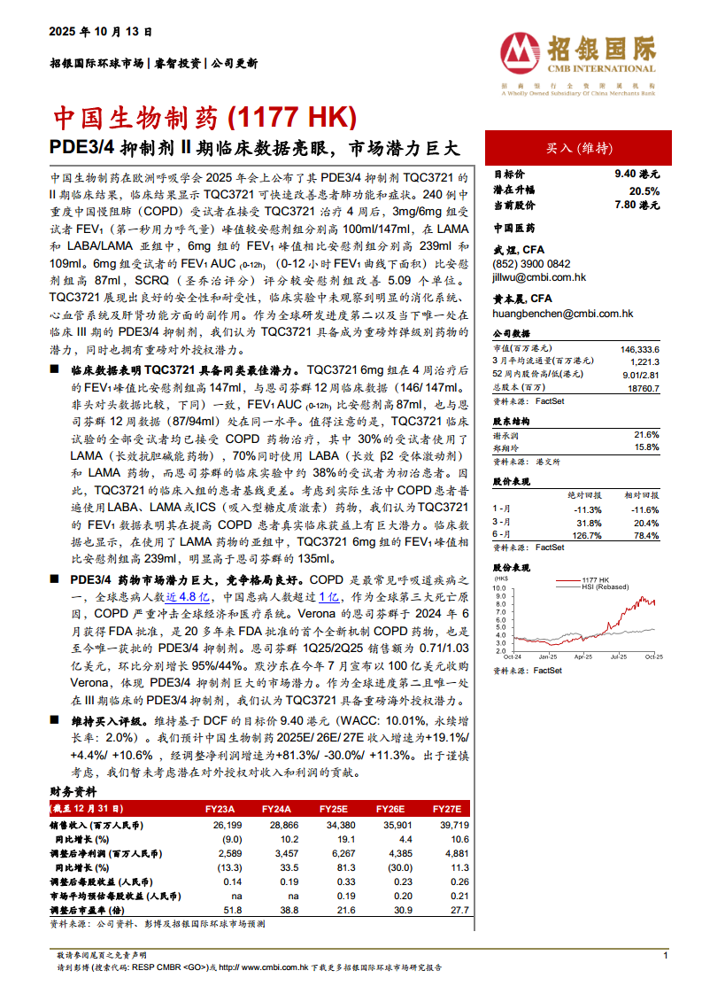 中国生物制药(01177):PDE3、4抑制剂II期临床数据亮眼,市场潜力巨大