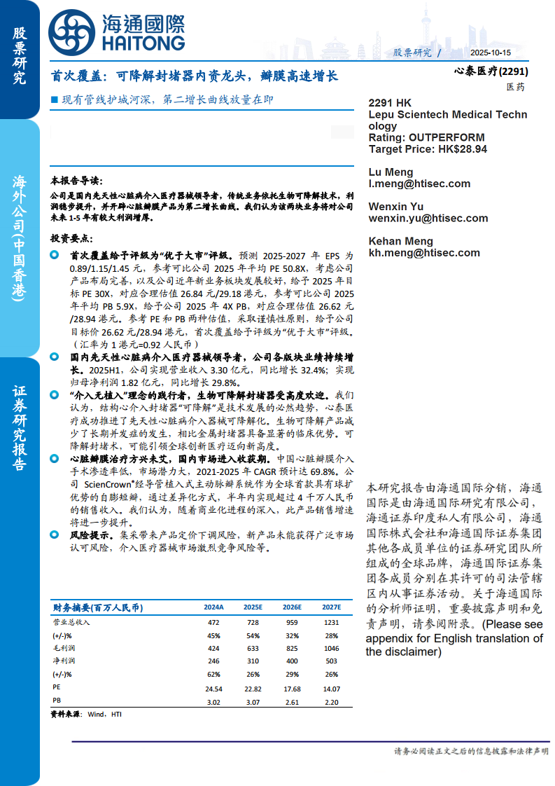 心泰医疗(02291):首次覆盖:可降解封堵器内资龙头,瓣膜高速增长