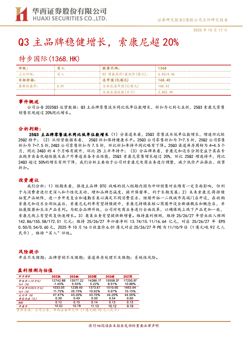特步国际(01368):Q3主品牌稳健增长,索康尼超20%