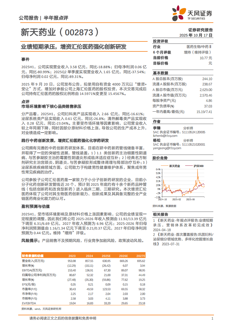新天药业(002873):业绩短期承压,增资汇伦医药强化创新研发
