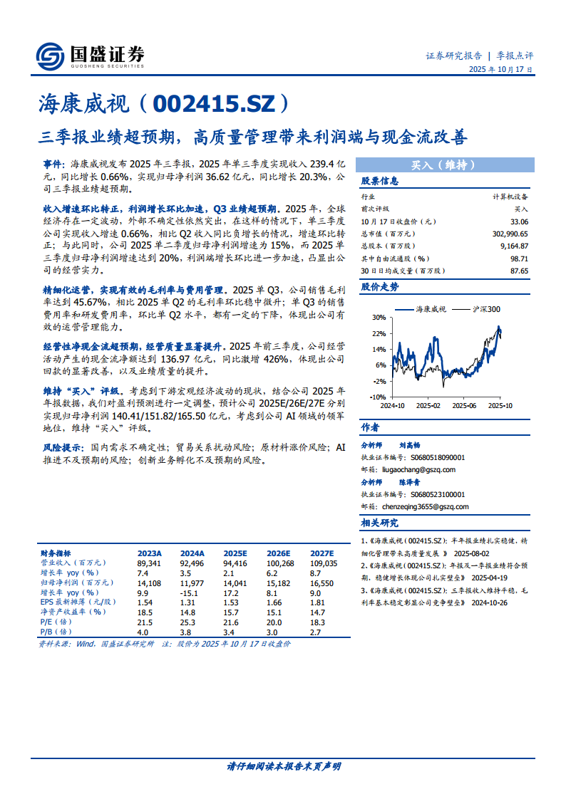 海康威视(002415):三季报业绩超预期,高质量管理带来利润端与现金流改善