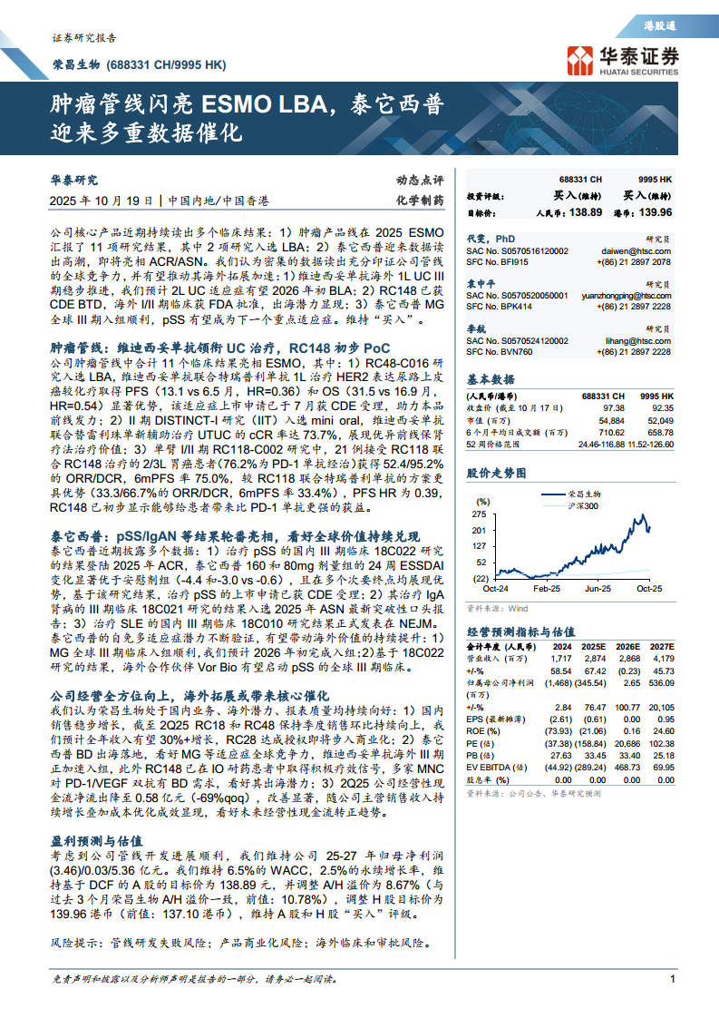 荣昌生物(688331):肿瘤管线闪亮ESMOLBA,泰它西普迎来多重数据催化