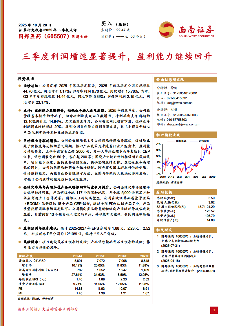 国邦医药(605507):三季度利润增速显著提升,盈利能力继续回升