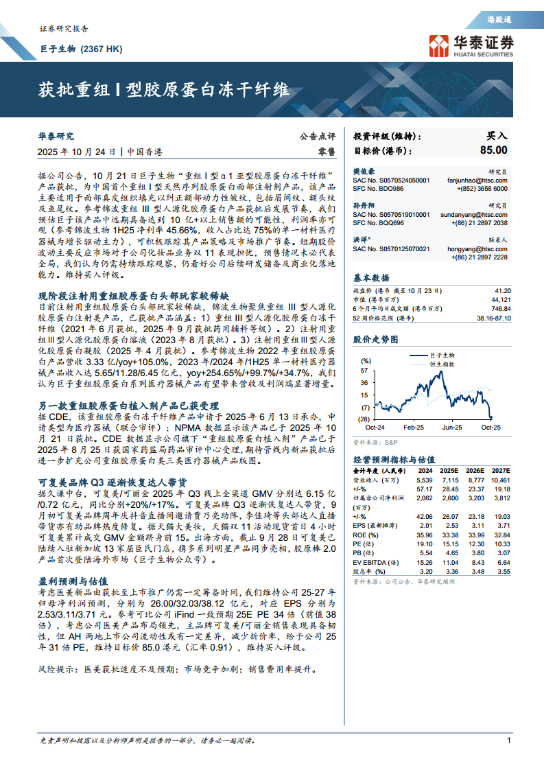 巨子生物(02367):获批重组I型胶原蛋白冻干纤维