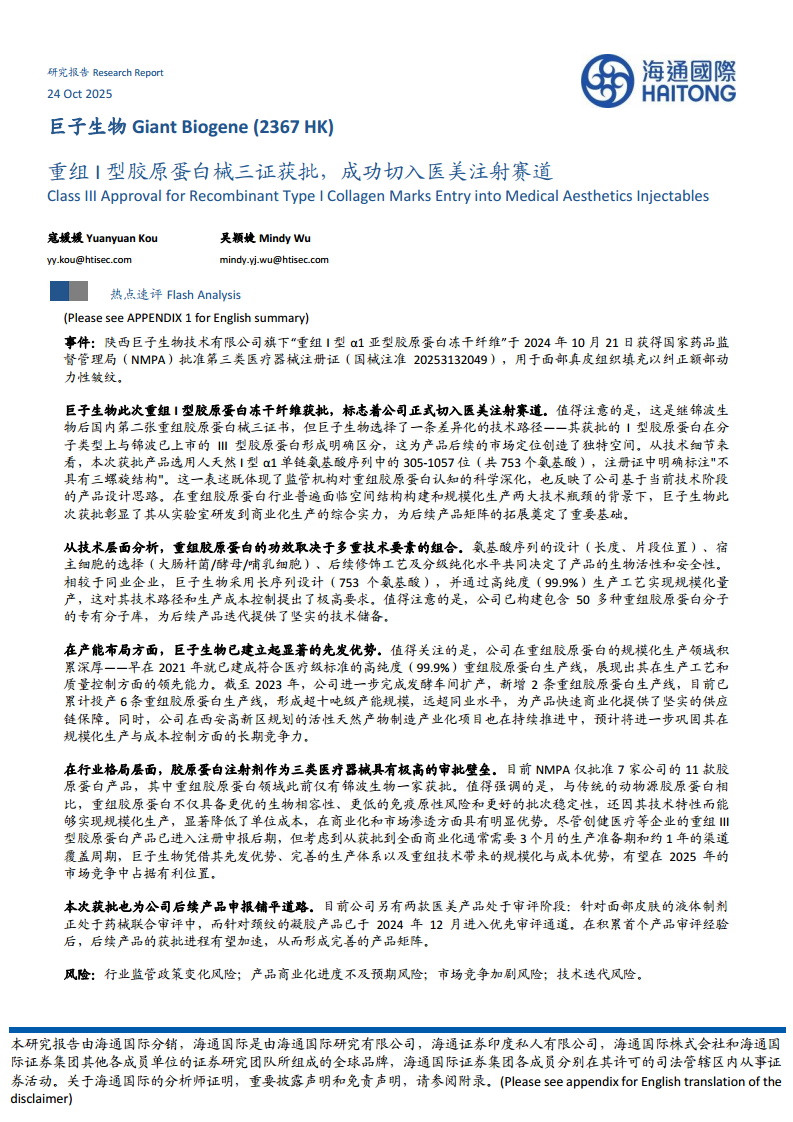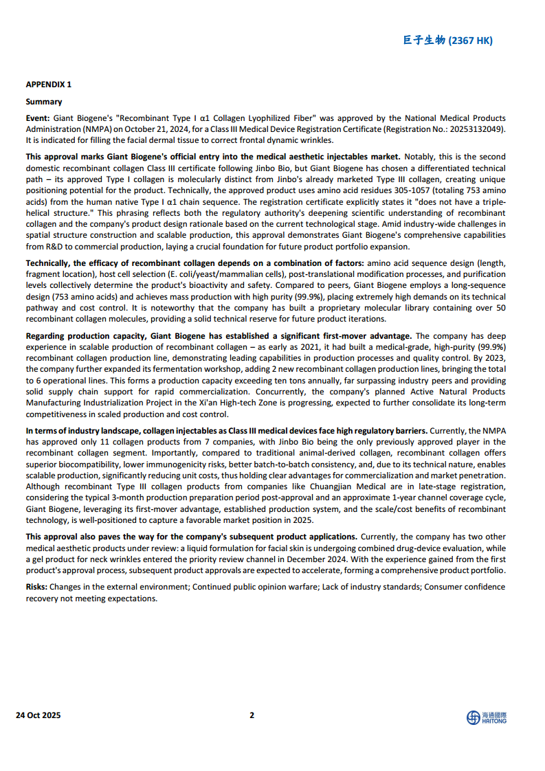 巨子生物(02367):重组I型胶原蛋白械三证获批,成功切入医美注射赛道