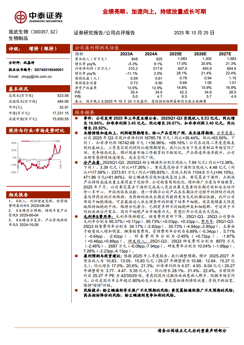 我武生物(300357):业绩亮眼、加速向上,持续放量成长可期