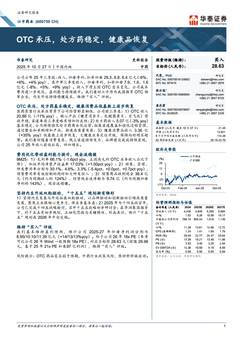 江中药业(600750):OTC承压,处方药稳定,健康品恢复