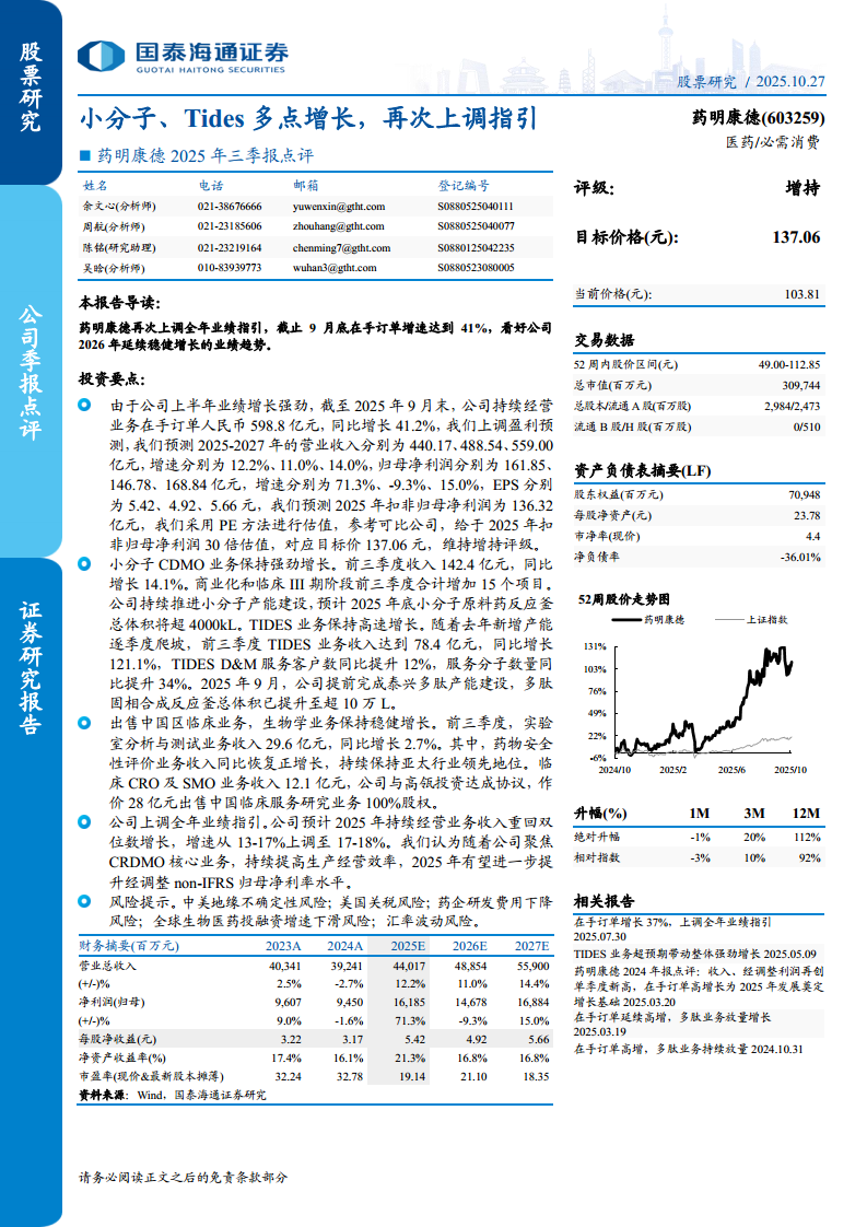 药明康德(603259):2025年三季报点评:小分子、Tides多点增长,再次上调指引