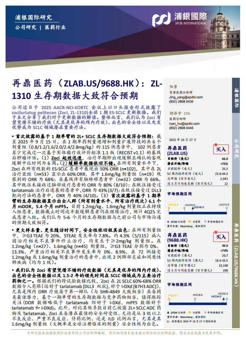 再鼎医药(ZLAB):ZL-1310生存期数据大致符合预期