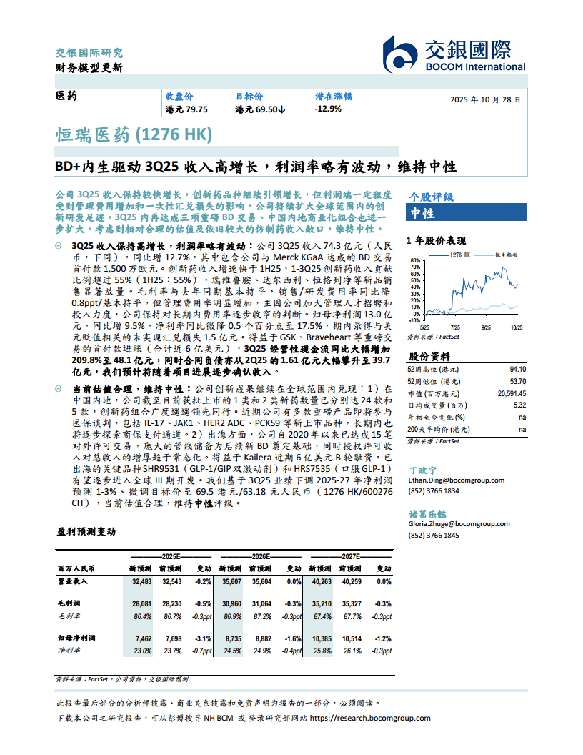 恒瑞医药(01276):BD+内生驱动3Q25收入高增长,利润率略有波动,维持中性