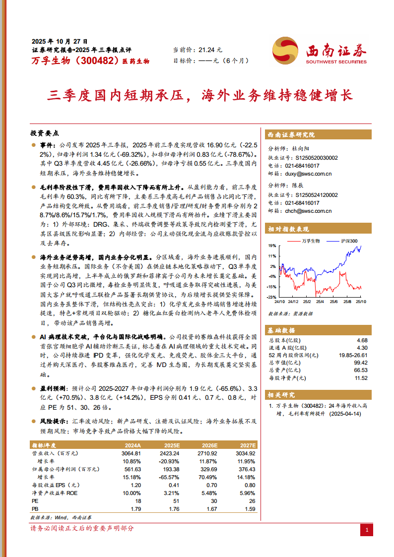 万孚生物(300482):三季度国内短期承压,海外业务维持稳健增长