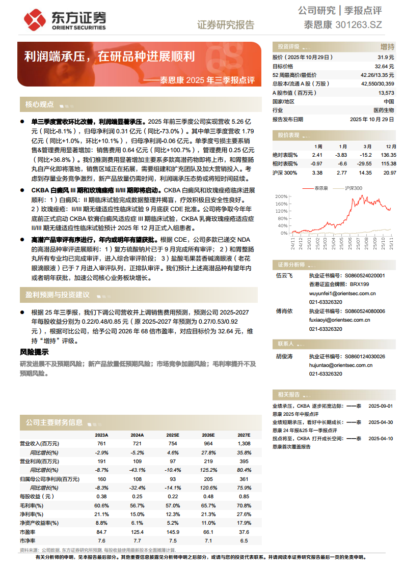 泰恩康(301263):利润端承压,在研品种进展顺利