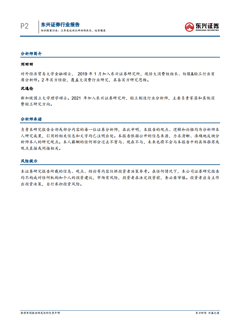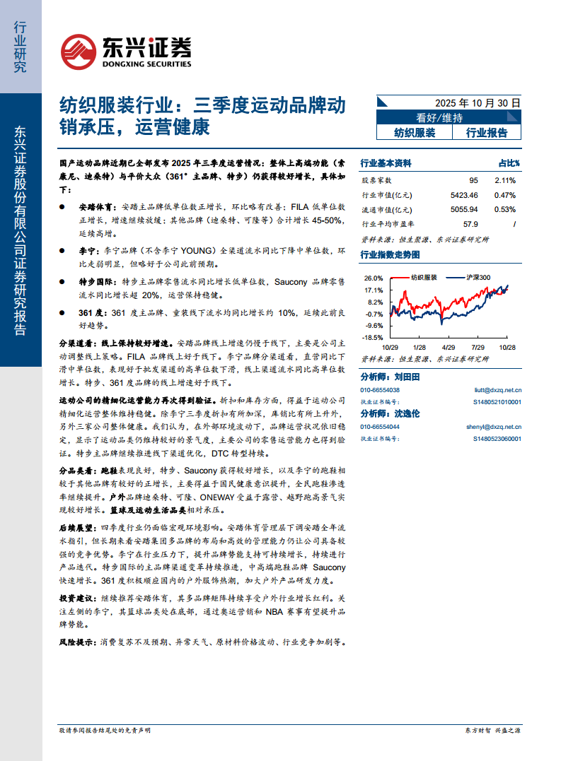 纺织服装行业:三季度运动品牌动销承压,运营健康