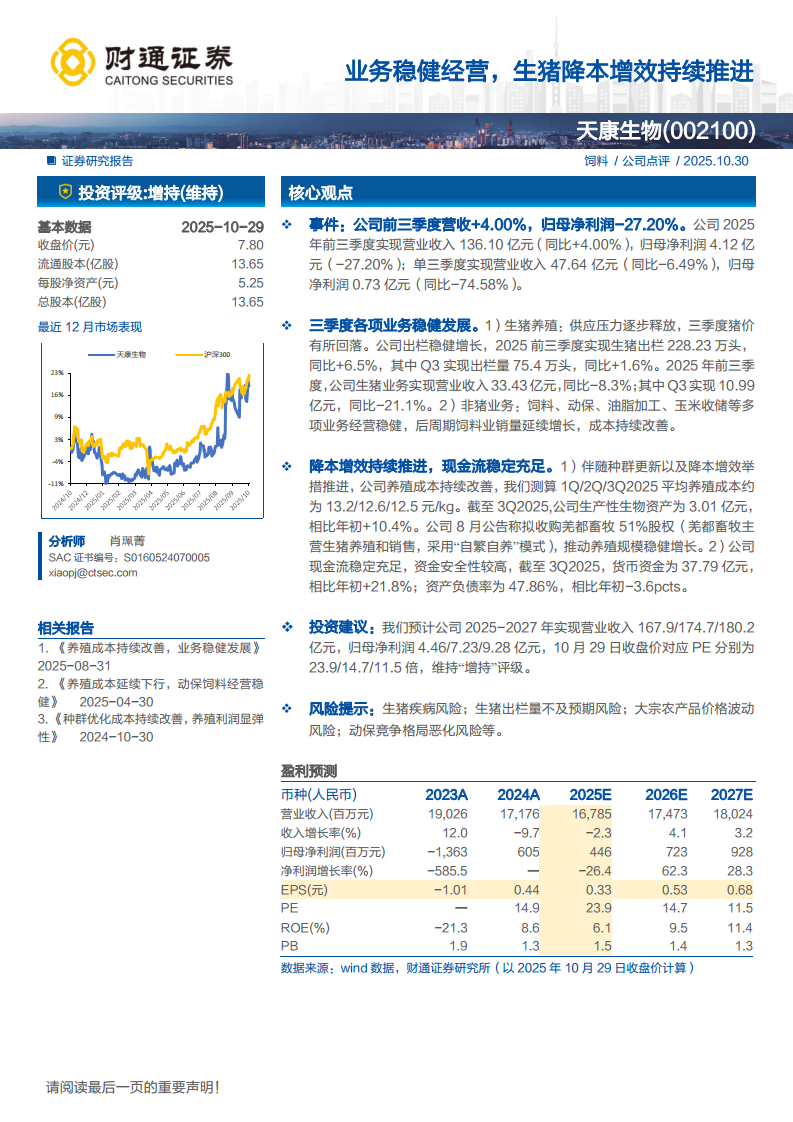 天康生物(002100):业务稳健经营,生猪降本增效持续推进