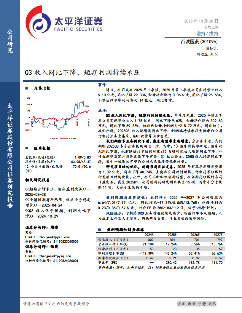 百诚医药(301096):Q3收入同比下降,短期利润持续承压