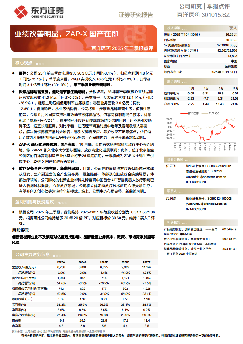 百洋医药(301015):2025 年三季报点评:业绩改善明显,ZAP-X国产在即