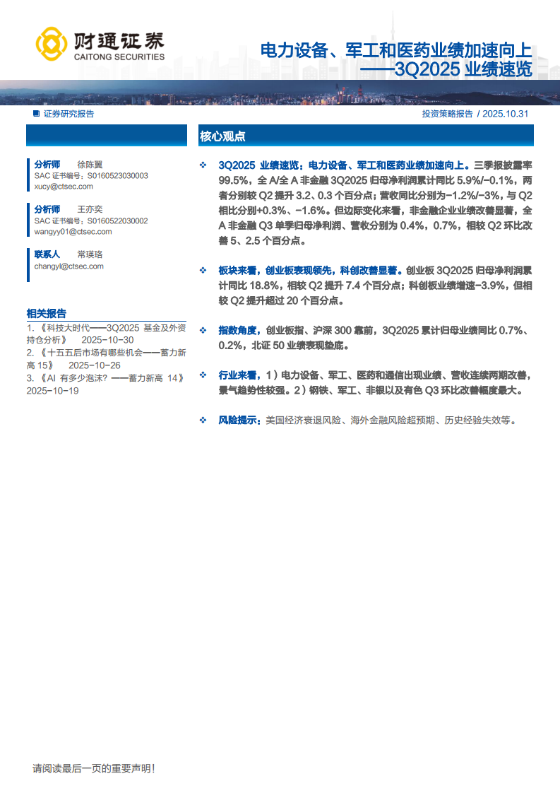 3Q2025业绩速览:电力设备、军工和医药业绩加速向上