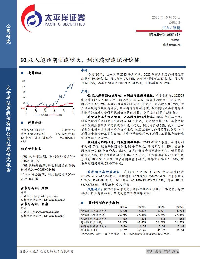 皓元医药(688131):Q3收入超预期快速增长,利润端增速保持稳健