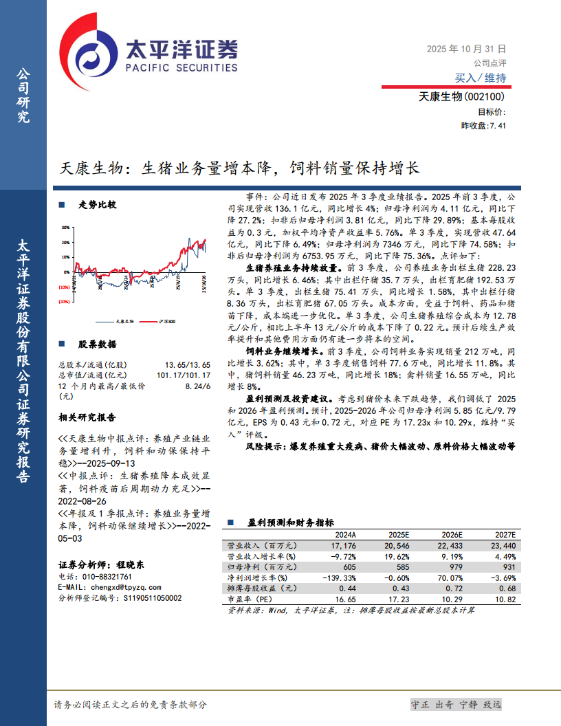 天康生物(002100):生猪业务量增本降,饲料销量保持增长