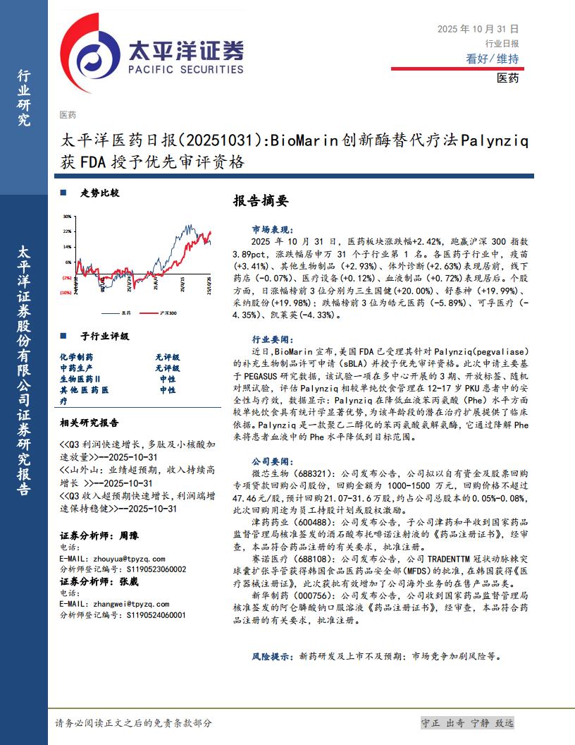 太平洋医药日报:BioMarin创新酶替代疗法Palynziq获FDA授予优先审评资格