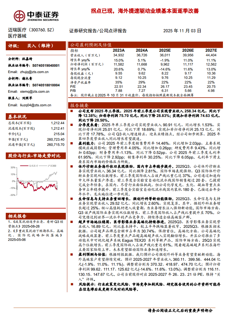 迈瑞医疗(300760):拐点已现,海外提速驱动业绩基本面逐季改善