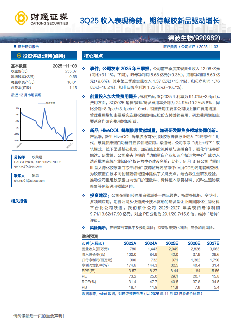 锦波生物(920982):3Q25收入表现稳健,期待凝胶新品驱动增长