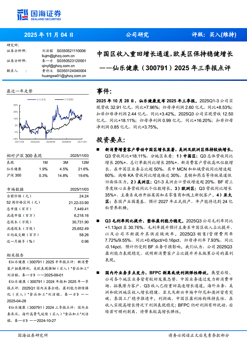 仙乐健康(300791):中国区收入重回增长通道,欧美区保持稳健增长:——仙乐健康(300791):2025年三季报点评