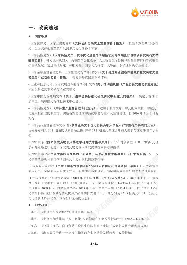 2.国家药监局发布《国家药监局关于发布优化全生命周期监管支持高端医疗器械创新发展有关举措的公告》,针对医用机器人、高端医学影像设备、人工智能医疗器械和新型生物材料等高端医疗器械领域,通过审批加速、标准完善、国际化支持等十大举措,系统性解决行业痛点。