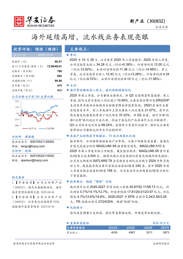 2025年前三季度,公司整体业绩承压,但Q3呈现明显恢复趋势。前三季度,国内主营业务收入同比减少10.95%,主要受集采降价及DRG/DIP支付改革导致部分检测项目检测量降低等因素影响;25Q1-3海外业务实现量质齐升,前三季度海外主营业务收入同比增长21.07%,其中试剂业务在仪器装机带动下同比增长37.23%。单Q3来看,海外市场“仪器+试剂”协同效应日益凸显,得益于高毛利产品在海外占比不断提升,Q3公司综合毛利率达69.24%,连续两个季度环比提升,国际化业务有望带动公司整体毛利率水平企稳回升。