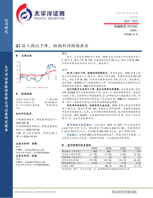 Q3收入同比下滑,短期利润持续承压。单季度来看,2025年第三季度公司实现营业收入1.78亿元,同比下降9.62%,归母净利润为302.60万元,同比下降59.36%,扣非后归母净利润为-218.72万元,同比转亏。我们判断,2025Q3收入端增速同比下滑、利润端持续承压大概率和公司仿制药业务受集采、MAH收紧等因素有关。