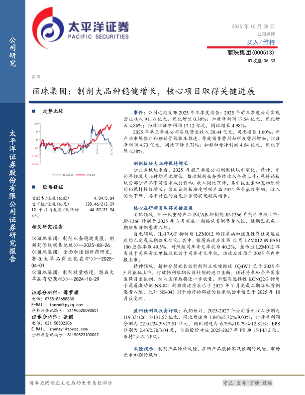 2025年第三季度公司实现营业收入28.44亿元,同比增长1.60%;新产品市场推广和创新管线临床推进,导致销售费用和研发费用增加,归母净利润4.73亿元,同比下降5.73%;扣非归母净利润4.54亿元,同比下降4.58%。