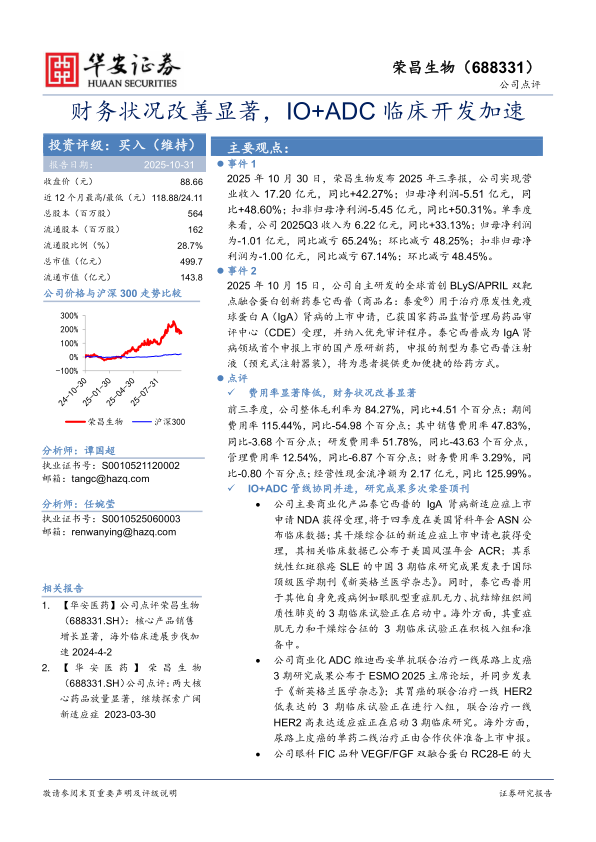 2025年10月30日,荣昌生物发布2025年三季报,公司实现营业收入17.20亿元,同比+42.27%;归母净利润-5.51亿元,同比+48.60%;扣非归母净利润-5.45亿元,同比+50.31%。单季度来看,公司2025Q3收入为6.22亿元,同比+33.13%;归母净利润为-1.01亿元,同比减亏65.24%;环比减亏48.25%;扣非归母净利润为-1.00亿元,同比减亏67.14%;环比减亏48.45%。