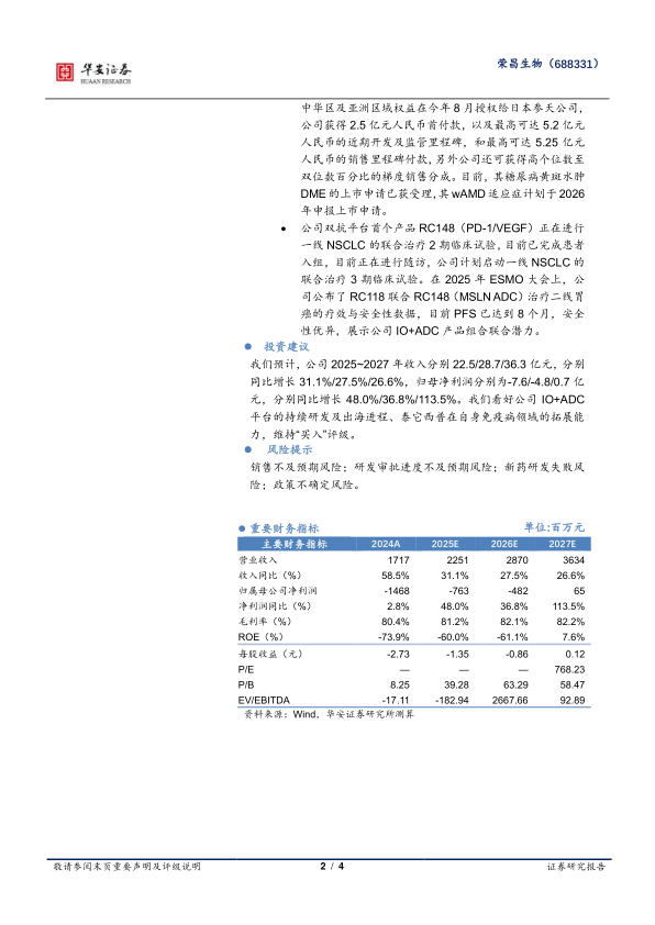 我们预计,公司2025~2027年收入分别22.5/28.7/36.3亿元,分别同比增长31.1%/27.5%/26.6%,归母净利润分别为-7.6/-4.8/0.7亿元,分别同比增长48.0%/36.8%/113.5%。我们看好公司IO+ADC平台的持续研发及出海进程、泰它西普在自身免疫病领域的拓展能力,维持“买入”评级。