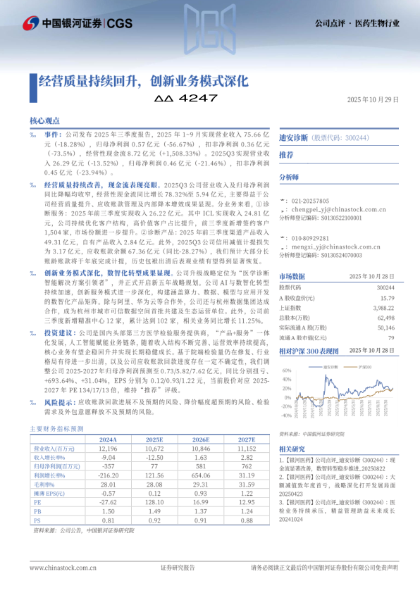 经营质量持续改善,现金流表现亮眼。2025Q3公司营业收入及归母净利润同比降幅均收窄,经营性现金流同比增长78.32%至5.94亿元,主要得益于公司经营质量提升、应收账款管理及内部降本增效成果显现。分业务来看,①诊断服务:2025年前三季度实现收入26.22亿元。其中ICL实现收入24.81亿元,公司持续优化客户结构,高价值客户占比提升,前三季度新增签约客户1,504家,市场份额进一步提升。②诊断产品:2025年前三季度渠道产品收入49.31亿元,自有产品收入2.84亿元。此外,2025Q3公司信用减值计提损失为3.17亿元,应收账款余额67.36亿元(同比-28.27%),我们预计大部分长账龄账款将于年底完成计提,历史包袱出清后表观业绩有望得到显著恢复。