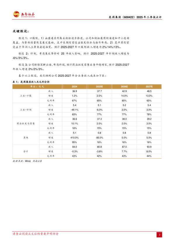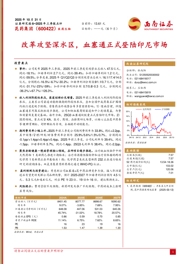 盈利预测与投资建议: 考虑到公司血塞通+昆中药品牌竞争力强,接入华润渠道后有望更好发挥公司品牌优势,预计 2025-2027 年归母净利润分别为 4.5 亿元、 5.3 亿元和 6.4 亿元,对应 PE 为 23倍、 19 倍和 16 倍,建议保持关注。
