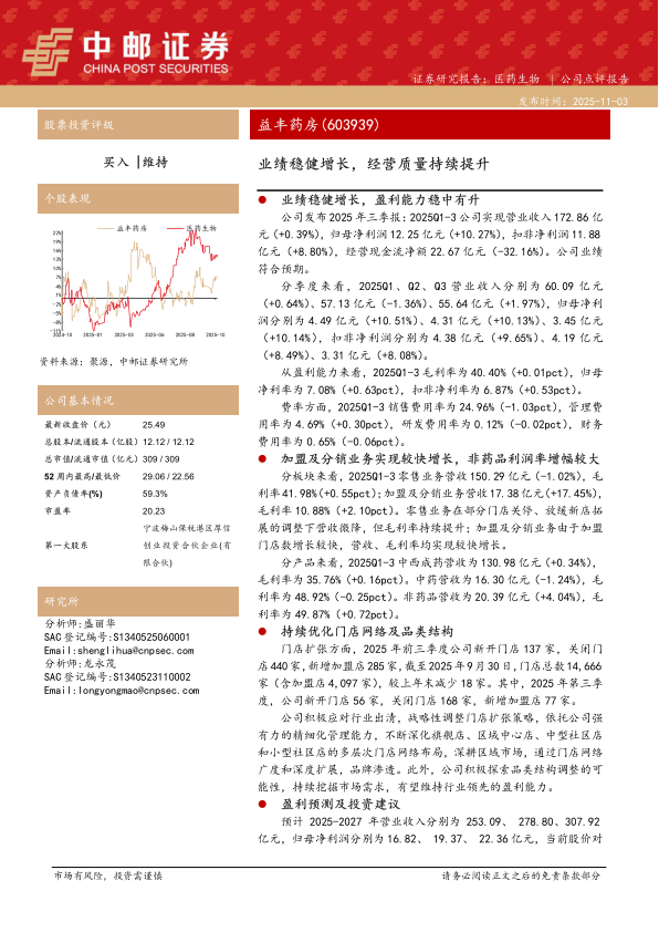 分产品来看,2025Q1-3中西成药营收为130.98亿元(+0.34%),毛利率为35.76%(+0.16pct)。中药营收为16.30亿元(-1.24%),毛利率为48.92%(-0.25pct)。非药品营收为20.39亿元(+4.04%),毛利率为49.87%(+0.72pct)。