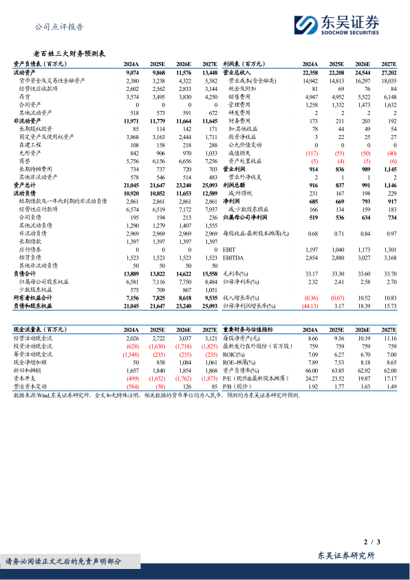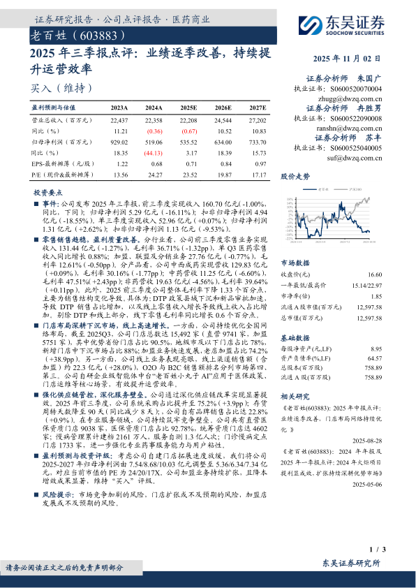 门店布局深耕下沉市场,线上高速增长。一方面,公司持续优化全国网络布局,截至2025Q3,公司门店总数达15,492家(直营9741家,加盟5751家),其中优势省份门店占比90.5%,地级市及以下门店占比78%,新增门店中下沉市场占比88%;加盟业务快速发展,老店加盟占比74.2%(+38.9pp)。另一方面,公司线上业务表现亮眼,线上渠道销售额(含加盟)约22.3亿元(+28.0%),O2O与B2C销售额排名分列市场第四、第三。公司自研企业级智能体中台“老百姓小丸子AI”应用于医保政策、门店运维等核心场景,有效提升运营效率。