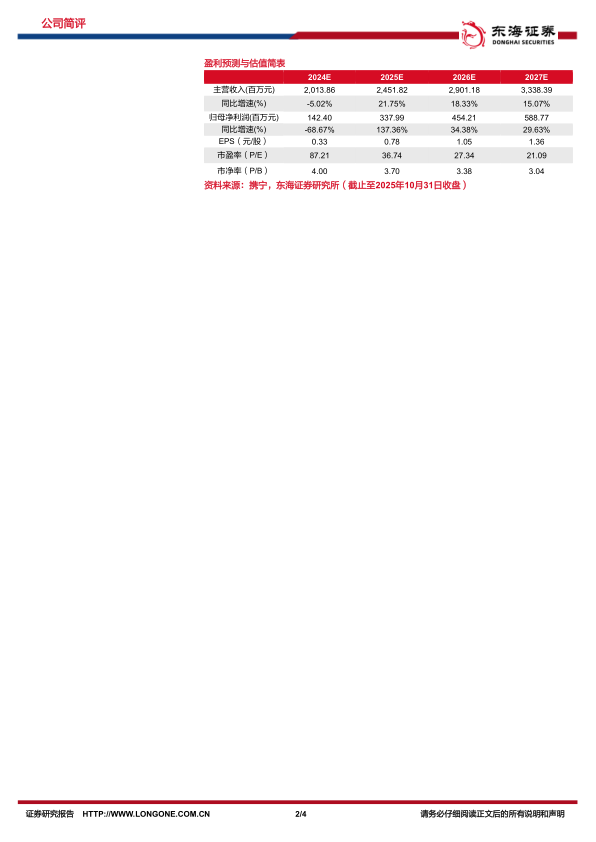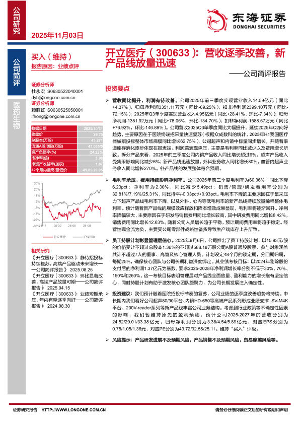 投资建议:我们预计随着医院招投标节奏的复苏,公司业绩的逐季度改善趋势将持续。中长期内我们看好公司超声80/90平台、内镜HD-650等高端产品系列形成业绩支撑,SV-M4K平台、200V-reader系列等新产品线丰富公司业务结构。考虑到行业政策等不确定性因素的影响,我们暂维持原先的盈利预测,预计公司2025-2027年的营收分别为24.52/29.01/33.38亿元,归母净利润分别为3.38/4.54/5.89亿元,对应EPS分别为0.78/1.05/1.36元,对应PE分别为43.72/32.55/25.11。维持“买入”评级。