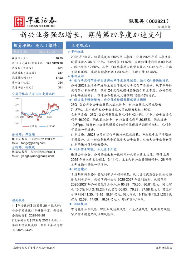 25Q1-3公司小分子业务收入基本持平,新兴业务收入同比增长71.87%,其中化学大分子业务收入同比增长超过150%。
