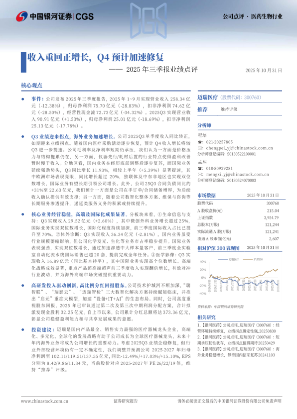 Q3业绩迎来拐点,海外业务加速增长。公司2025Q3单季度收入同比转正,如期迎来业绩拐点。随着国内医疗采购活动逐步恢复,预计Q4收入增长将较Q3进一步提速。公司毛利率及净利率短期仍承压,我们认为一方面是价格压力与结构拖累仍在,另一方面,仪器先行/耗材后置的行业特点使得盈利改善暂时慢于收入。分地区看,国内业务在经历底部调整后逐步复苏,而国际业务延续强劲势头,Q3同比增长11.93%,相较上半年(5.39%)显著提速,其中欧洲市场表现亮眼,同比增长超过20%,独联体及中东非地区也实现双位数增长,国际业务有望长期引领公司增长。此外,公司25Q3合同负债同比约31%至22.63亿元,我们预计一方面是公司在手订单/合同储备增厚,为后续收入确认提供有效支撑;另一方面,随着公司数智化整体方案、维保与咨询等长期服务渗透提升,递延类服务义务的积累或持续提升。核心业务经营稳健,高端及国际化成果显著。分板块来看,①生命信息与支持:Q3实现收入29.52亿元(2.60%),其中微创外科业务增长超过25%,国际业务实现双位数增长,国际化程度持续加深,前三季度国际收入占比已提升至70%。②体外诊断:Q3实现收入36.34亿元(-2.81%),国内业务虽受行业规模萎缩影响,但公司化学发光、生化等业务市占率稳步提升。国际业务表现强劲,实现双位数增长,通过加速渗透中大样本量客户,前三季度全实验室自动化流水线国际销售已超20套,提前完成全年任务。③医学影像:Q3实现收入16.89亿元(同比基本持平),其中国际业务实现高个位数增长。高端化战略成效显著,重点产品超高端超声前三季度收入实现翻倍增长,有效对冲行业波动,并为海外高端市场突破提供重要动力。