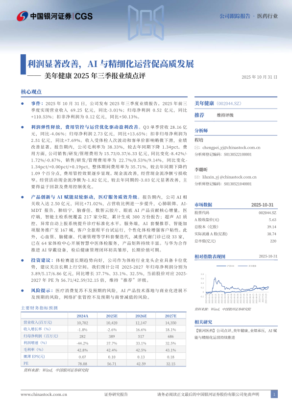 美年健康2025年三季报业绩点评:利润显著改善,AI与精细化运营促高质发展