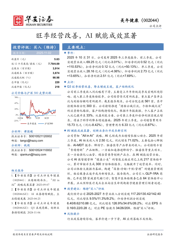 公司贯彻“All in AI”战略,AI已经成为业绩增长核心动力。2025年前三季度,AI相关收入为2.50亿元,同比增长71.02%,主要包括心肺联筛、AI-MDT报告、肺结宁、脑睿佳等产品带来的收入。公司持续丰富“专精特新”产品矩阵,一方面加速推进肺结宁、脑睿佳等重点项目,另一方面强化心血管、精准营养等创新产品力。在AI赋能运营方面,公司AI数智健管师“健康小美”的智能主检应用已上线217家体检中心,累计审核并生成300万份体检报告,大幅提升了运营效率。同时,公司以体检大数据为基础,构建“筛查-诊断-干预-管理”的健康管理闭环,检后服务正逐步成为新增长点。报告期内,公司引入GLP-1RA药物,已开设33家减重代谢门诊;智慧中医体检服务已在64家体检中心开展,正从预防医疗龙头企业向全生命周期数字健康管理引领者迈进。投资建议:维持“买入”评级