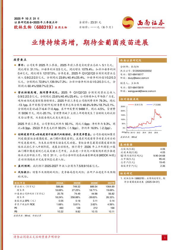 营收持续高增,期间费率优化。2025年Q1/Q2/Q3分别实现营业总收入0.9/2.2/2.0亿元,分别同比23.6%/40.4%/25.4%。公司持续加大市场推广力度,吸附破伤风疫苗销售持续增长。2025年前三季度公司期间费用率79.3%,同比-13.1pp,其中销售/管理/研发/财务费用率总体分别为48.6%/9.9%/18.7%/2.1%,分别同比变动+0.7/-6.4/-7/-0.4pp,其中研发费用9488万,同比-4.5%,管理费用5036万元,同比-20.1%,管理费用减少主因上年同期发生了金额较大的试验及验证费用,而本报告期无此类大额支出。