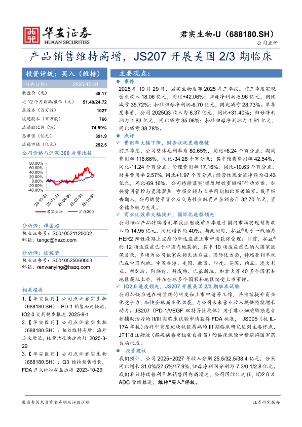 我们预计,公司2025~2027年收入分别25.5/32.5/38.4亿元,分别同比增长31.0%/27.5%/17.9%,归母净利润分别为-7.3/0.1/2.8亿元。我们看好特瑞普利单抗销售国内高增速,公司国际化进程,IO2.0及ADC管线推进,维持“买入”评级。