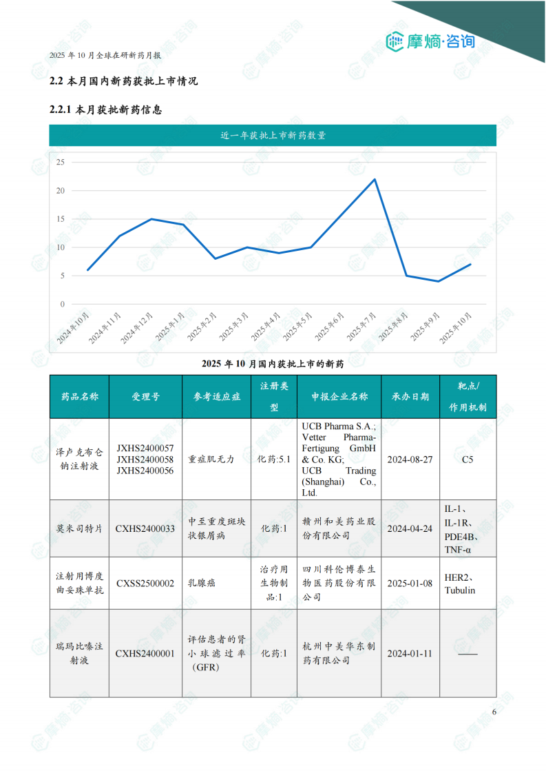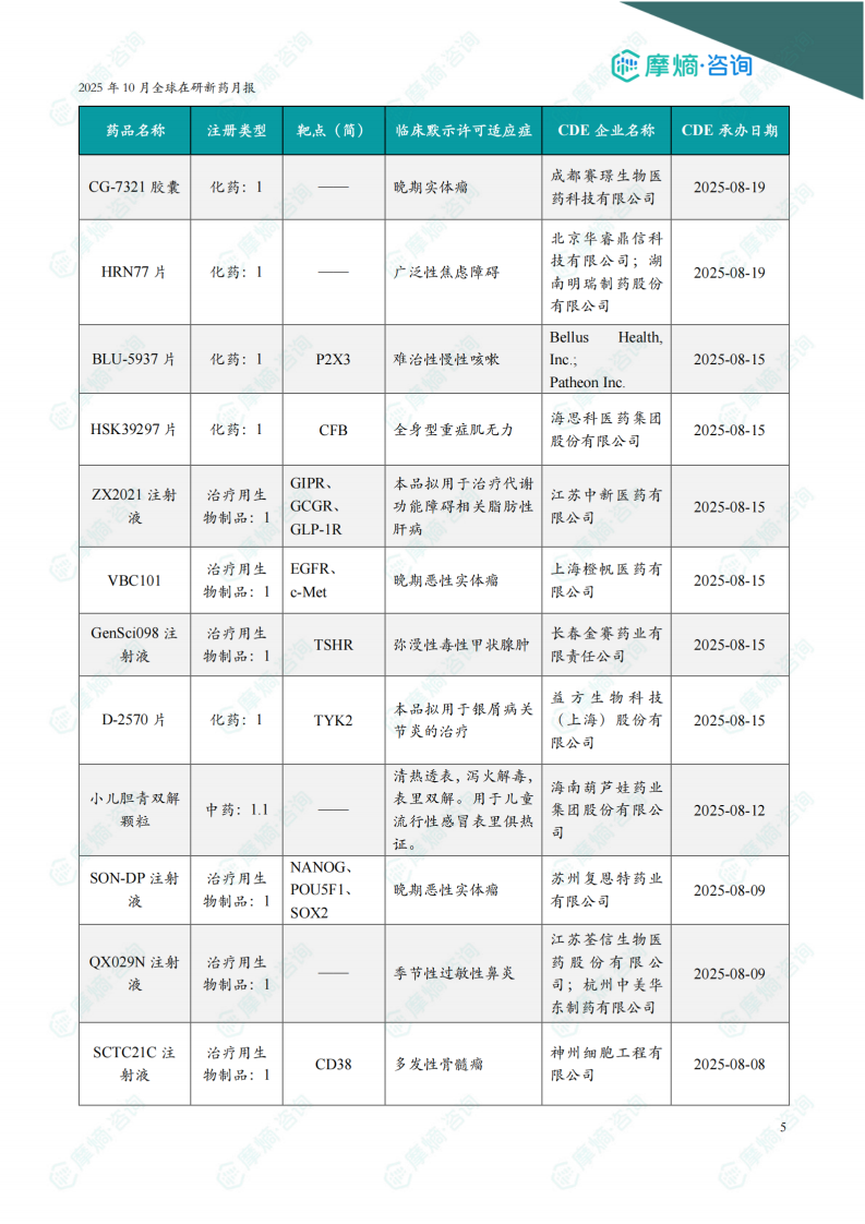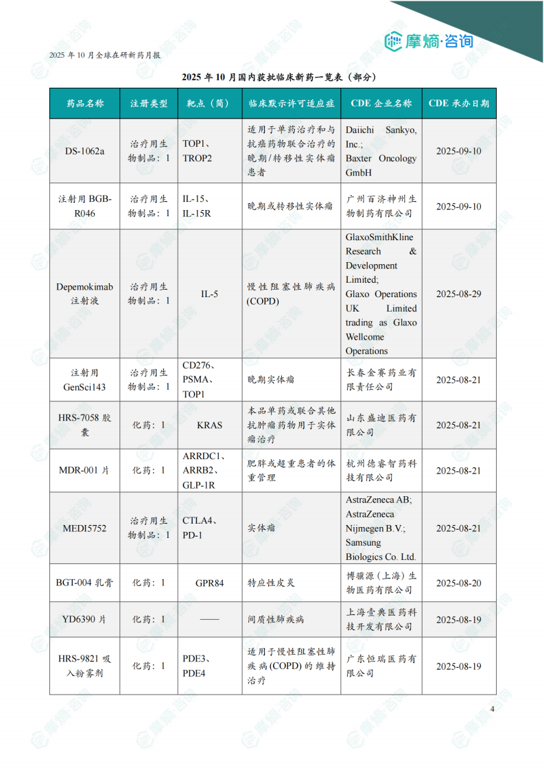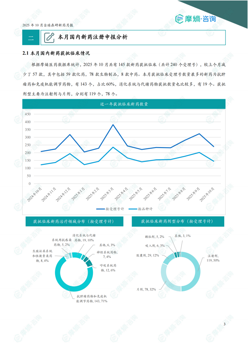 根据摩熵医药数据库统计,2025年10月共有145款新药获批临床(共计240个受理号),较上个月减少了57款,其中包括59款化药,78款生物制品,8款中药。