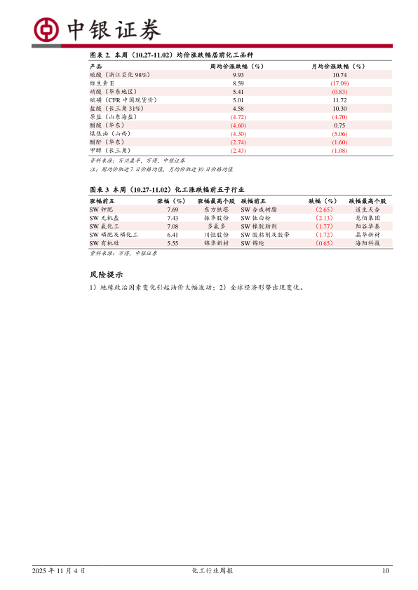 本周(10.27-11.02)均价跟踪的100个化工品种中,共有29个品种价格上涨,39个品种价格下跌,32个品种价格稳定。跟踪的产品中28%的产品月均价环比上涨57%的产品月均价环比下跌,15%的产品月均价环比持平。周均价涨幅居前的品种分别是硫酸(浙江巨化98%)、维生素E、硝酸(华东地区)、硫磺(CFR中国现货价)、盐酸(长三角31%);周均价跌幅居前的品种分别是原盐(山东海盐)、醋酸(华东)、煤焦油(山西)、醋酐(华东)、甲醇(长三角)。
