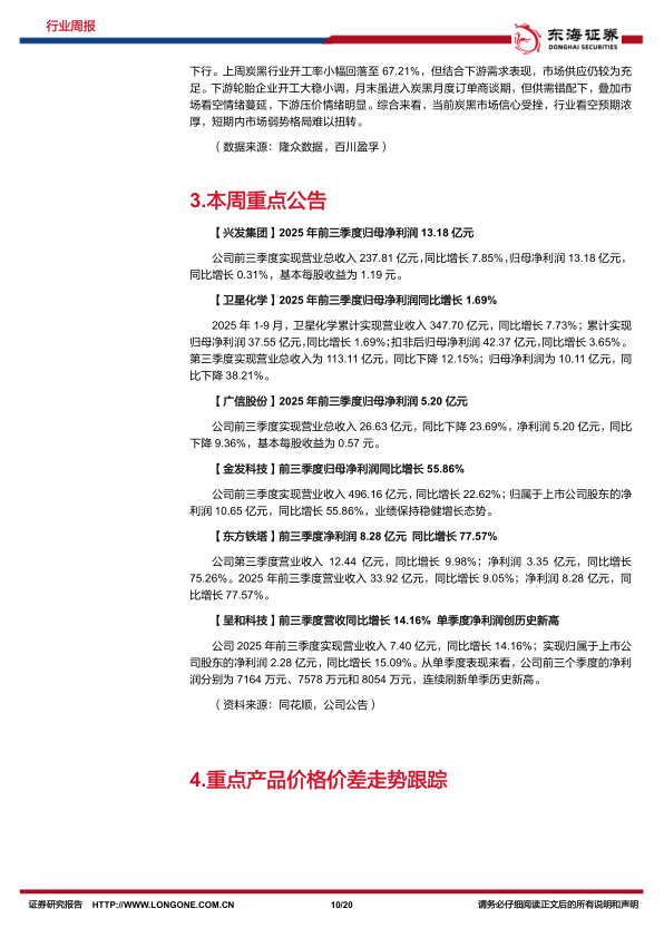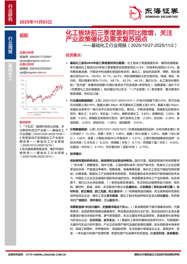 基础化工板块2025年前三季度盈利同比略增:化工板块三季报披露完毕,据同花顺数据,申万基础化工板块2025年前三季度整体实现营收同比+2.6%,归母净利润同比+9.4%,盈利整体略改善;子板块中利润增长明显的有农药、氟化工、胶粘剂及胶带、钾肥,同比增速分别为201%、124.6%、91.7%、62.2%;而利润降幅较大的为有机硅、纯碱、锦纶、钛白粉,同比增速分别为-73.0%、-68.7%、-52.3%、-46.3%。我们认为,化工板块长期乐观(“反内卷”改善供给预期+价格价差多处于历史底部+库存低位),短期谨慎(油价下行+四季度化工品价格磨底),拐点催化可以关注:1)产业政策;2)需求复苏,重点看海外降息周期,利好出口链。